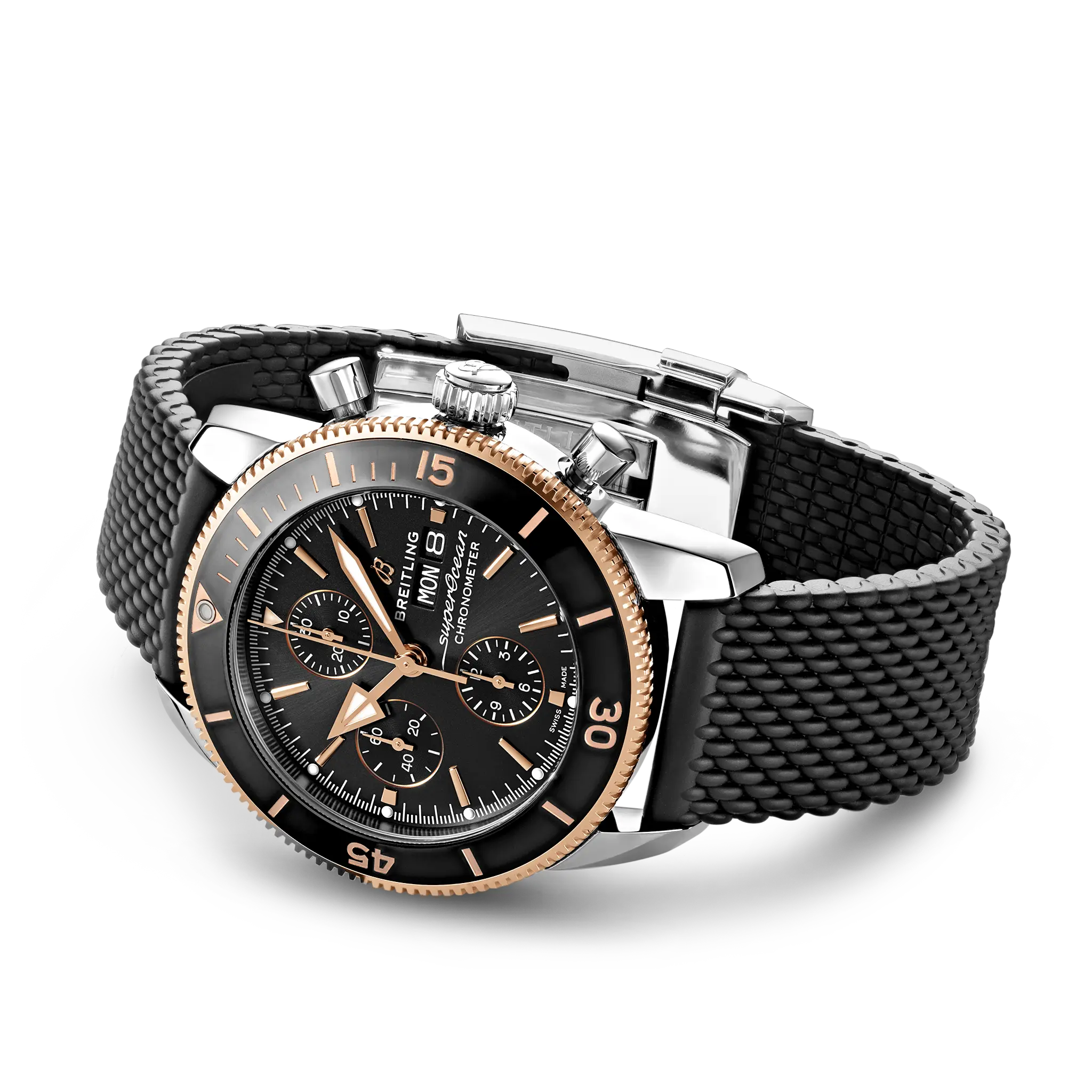 The Breitling Superocean Heritage II Chronograph 44 Men's Watch U13313121B1S1 is an exceptional timepiece for diving enthusiasts. Crafted with a polished stainless steel case and a black Aero Classic rubber strap, this watch exudes both durability and style. Its polished solid 18k rose gold unidirectional rotating bezel adds a touch of elegance to the design. The black dial is accented with rose gold elements and features luminescent hour and minute hands, as well as dots tipping the index hour markers. At 3 o'clock, you'll find the day of the week and date displayed in dial apertures, while the chronograph offers a large central seconds hand, a 30-minute counter sub-dial at 12 o'clock, and a 12-hour counter sub-dial at 6 o'clock. For added convenience, there is also a small seconds sub-dial at 9 o'clock.