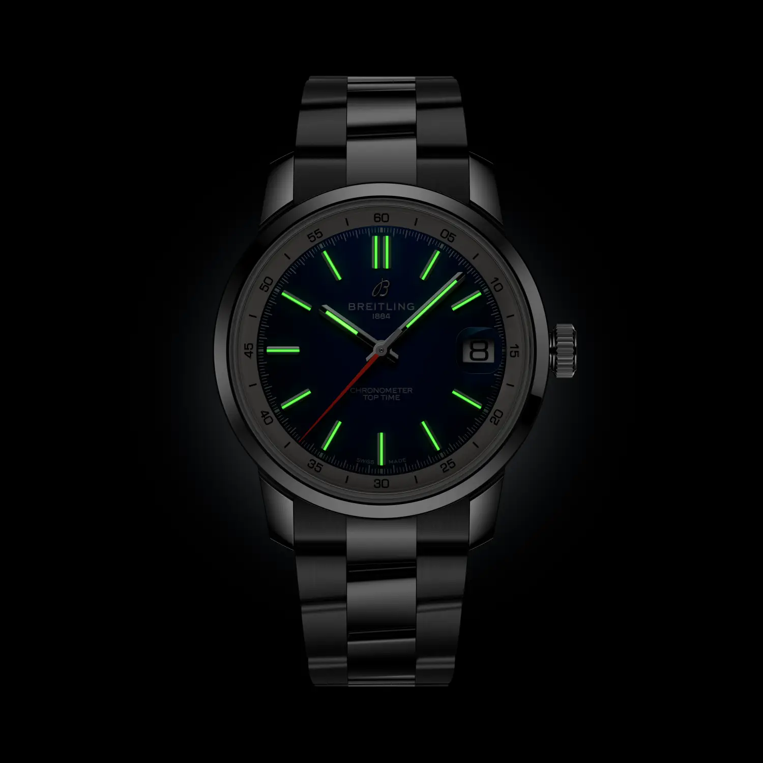 Silver-tone stainless steel case and bracelet. Fixed silver-tone stainless steel bezel. Blue dial with silver-tone hands and index hour markers. Minute scale around the inner rim. Dial Type: Analog. Luminescent hands and markers. Date display at the 3 o'clock position. Breitling Calibre B31 hand wind movement with a 78-hour power reserve. Scratch resistant sapphire crystal. Pull / push crown. Transparent see through case back. Round case shape, case size: 38 mm, case thickness: 20.05 mm. Band width: 18 mm. Tang clasp. Water resistant at 100 meters / 330 feet. Functions: date, hour, minute, second, chronometer. Top Time B31 Series. Watch label: Swiss Made. Breitling Top Time B31 Hand Wind Chronometer Blue Dial Men's Watch AB3113A71C1A1.