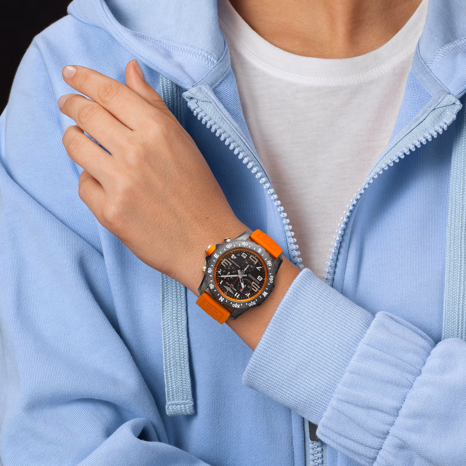 Introducing the Breitling Endurance Pro Chronometer 44mm Men's Watch X82310A51B1S1. This precision timepiece showcases a Breitlight black polymer case and bezel, paired with an orange rubber strap for a lightweight and durable build. The black dial includes a pulsometer scale, chronograph, and date function, all powered by the reliable Breitling Caliber 82 SuperQuartz COSC Chronometer certified movement.