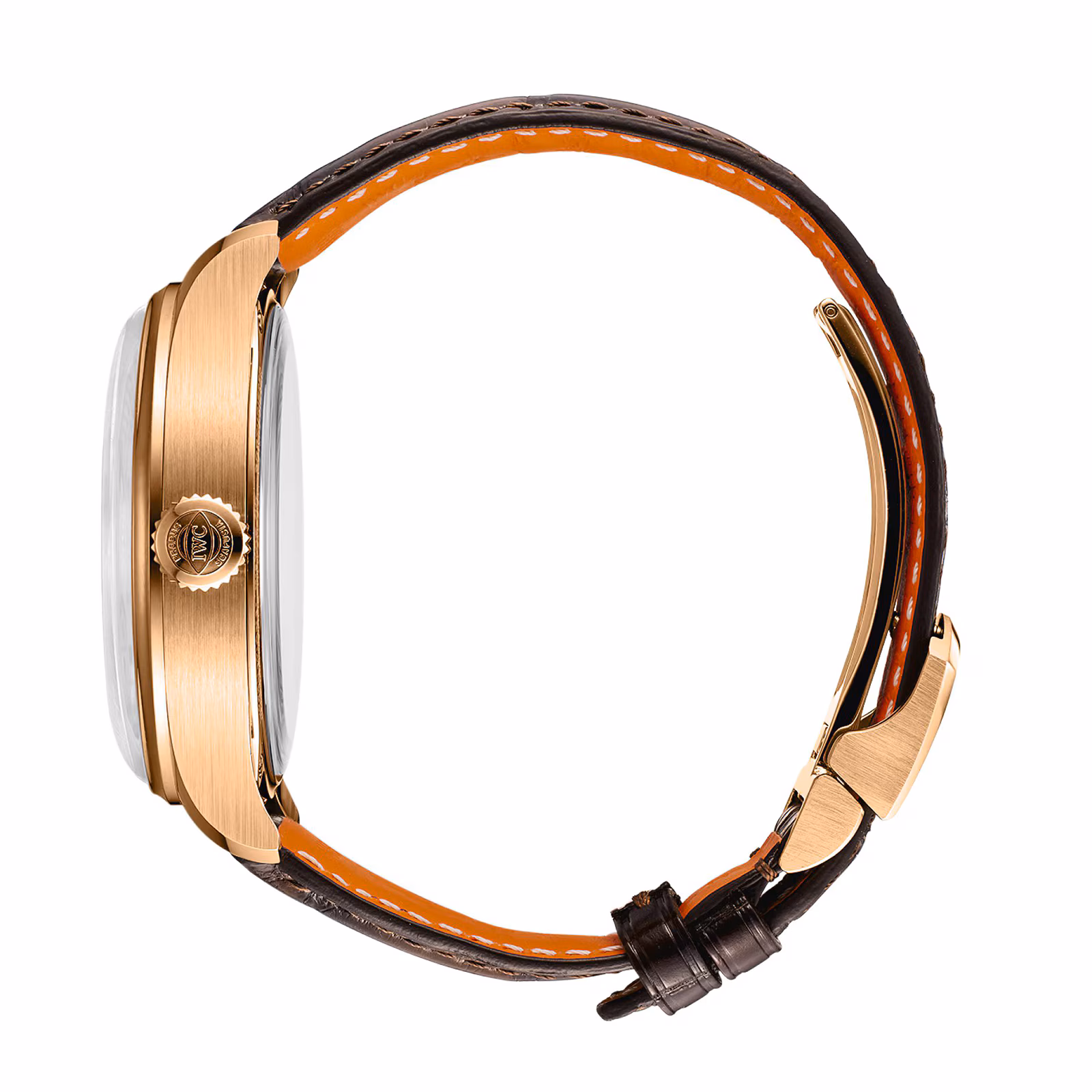 - Presented in a completely re-engineered 44mm 18K rose gold case secured with a dark brown leather strap by Santoni