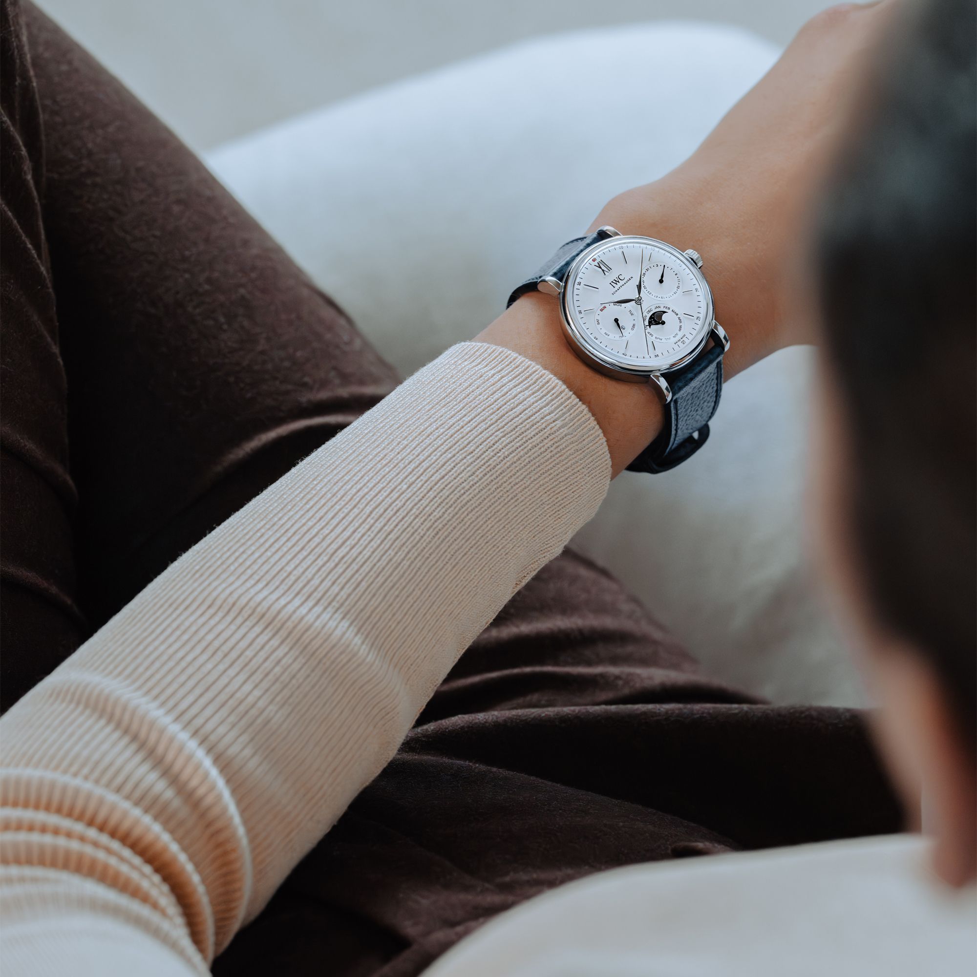 The Portofino Perpetual Calendar features the legendary perpetual calendar developed by Kurt Klaus during the 1980s. At 40 millimeters, the Portofino Perpetual Calendar is the smallest perpetual calendar in IWC’s portfolio. This version features stainless steel case, a silver-plated dial, and gold-plated hands and appliques, marking the first time the perpetual calendar is available in stainless steel in the Portofino collection. IWC’s legendary perpetual calendar was originally engineered during the 1980s by the brand’s former head-watchmaker, Kurt Klaus. The ingenious mechanism is mechanically programmed to recognize the different lengths of the months as well as the leap years. It will run without any adjustments until the year 2100. The calendar information is displayed in three subdials at 3, 6, and 9 o’clock. Made of solid gold, the moon phase indication shows the moon against the backdrop of a star-studded night sky. Thanks to a special reduction gear train, it is so precise that it will only deviate by one day from the orbit of Earth’s satellite after 577.5 years. Through the transparent sapphire glass back, one can catch a glimpse of the IWC-manufactured 82650 caliber. Engineered with a focus on robustness and precision, this high-end automatic movement features IWC’s Pellaton winding system, which has been reinforced with ceramic components and builds up a power reserve of 60 hours. This exclusive timepiece is fitted with a blue calfskin strap with a butterfly clasp.