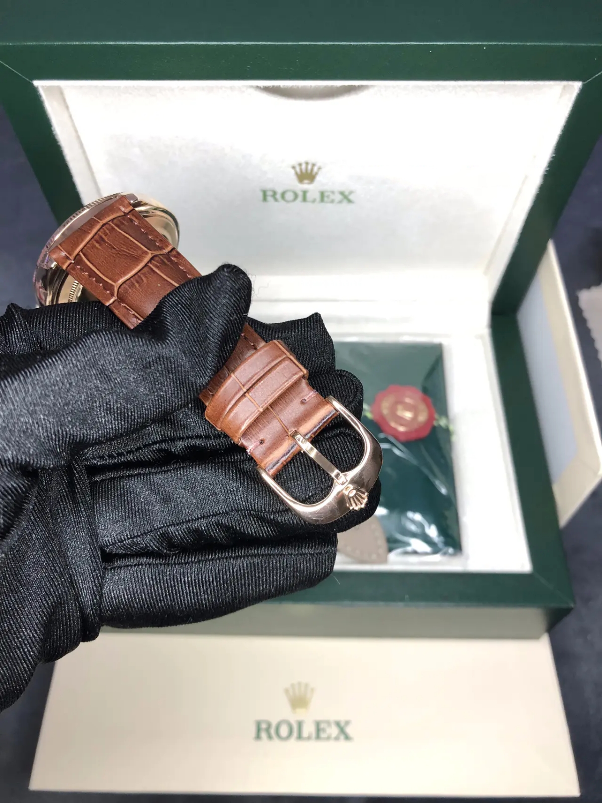 | Bracelet: | Brown leather strap with an 18K rose gold folding clasp. |