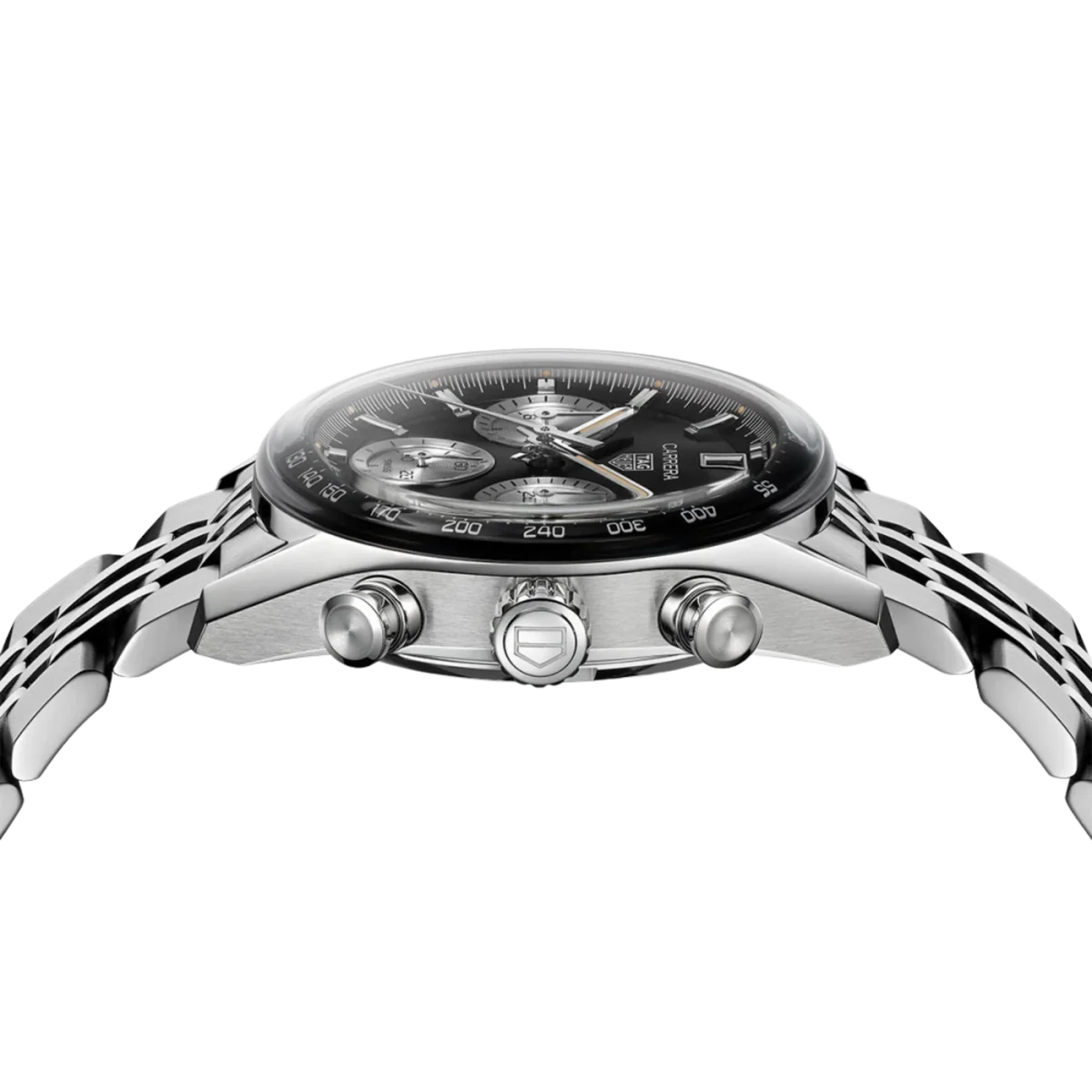 One of the most notable features of this TAG Heuer Carrera Chronograph watch reference CBS2210.BA0048 is its piston style push pieces located at 2 and 4 o’clock on its 39mm stainless steel case. They evoke the chronograph watches of yesteryear, particularly some of Jack Heuer’s first designs and, of course, the role this Swiss watchmaker played in the development of the first automatic movement. The 100 meter water resistant model is completed on a stylish 7 link stainless steel bracelet, securing with a robust folding clasp bearing the brand’s Sheild logo.