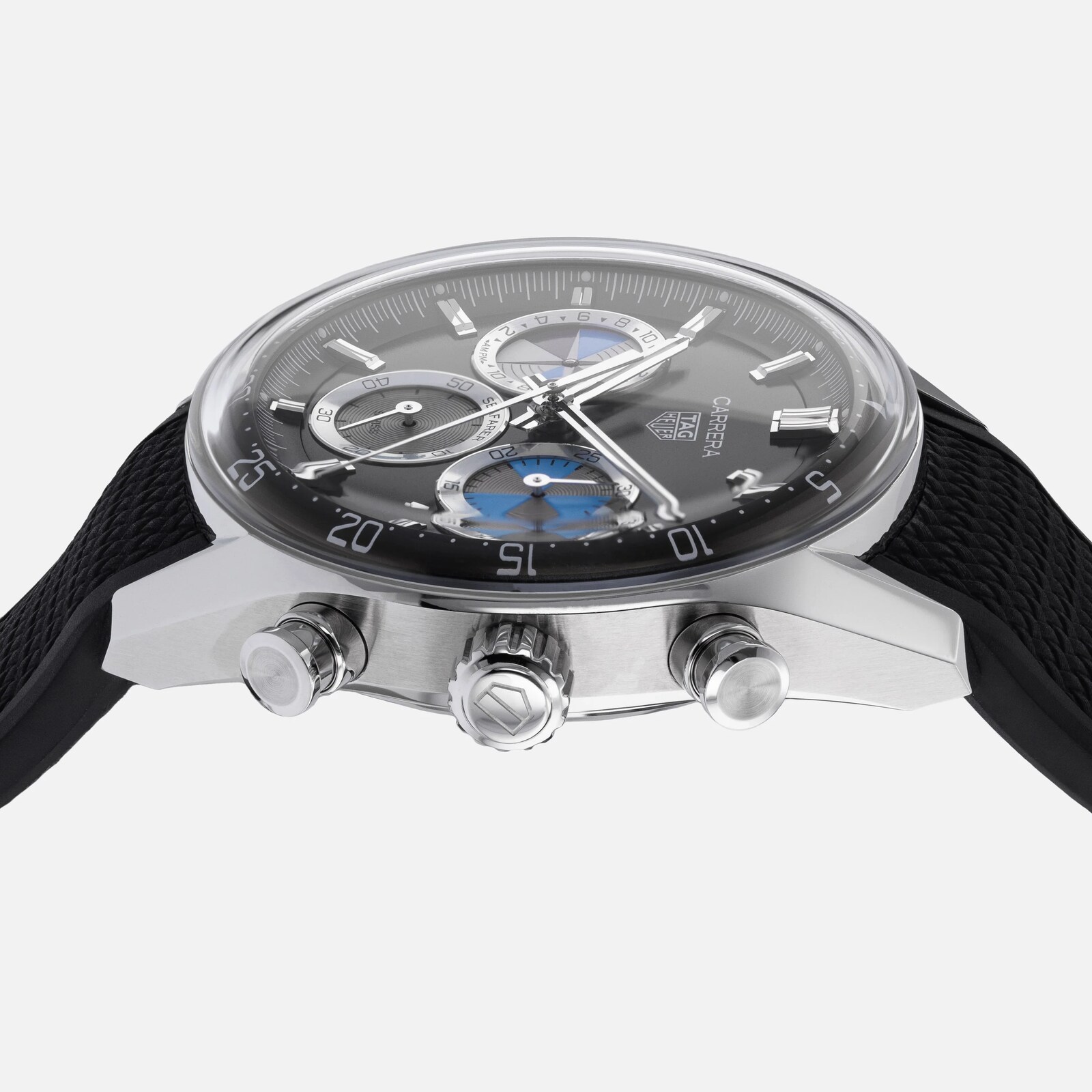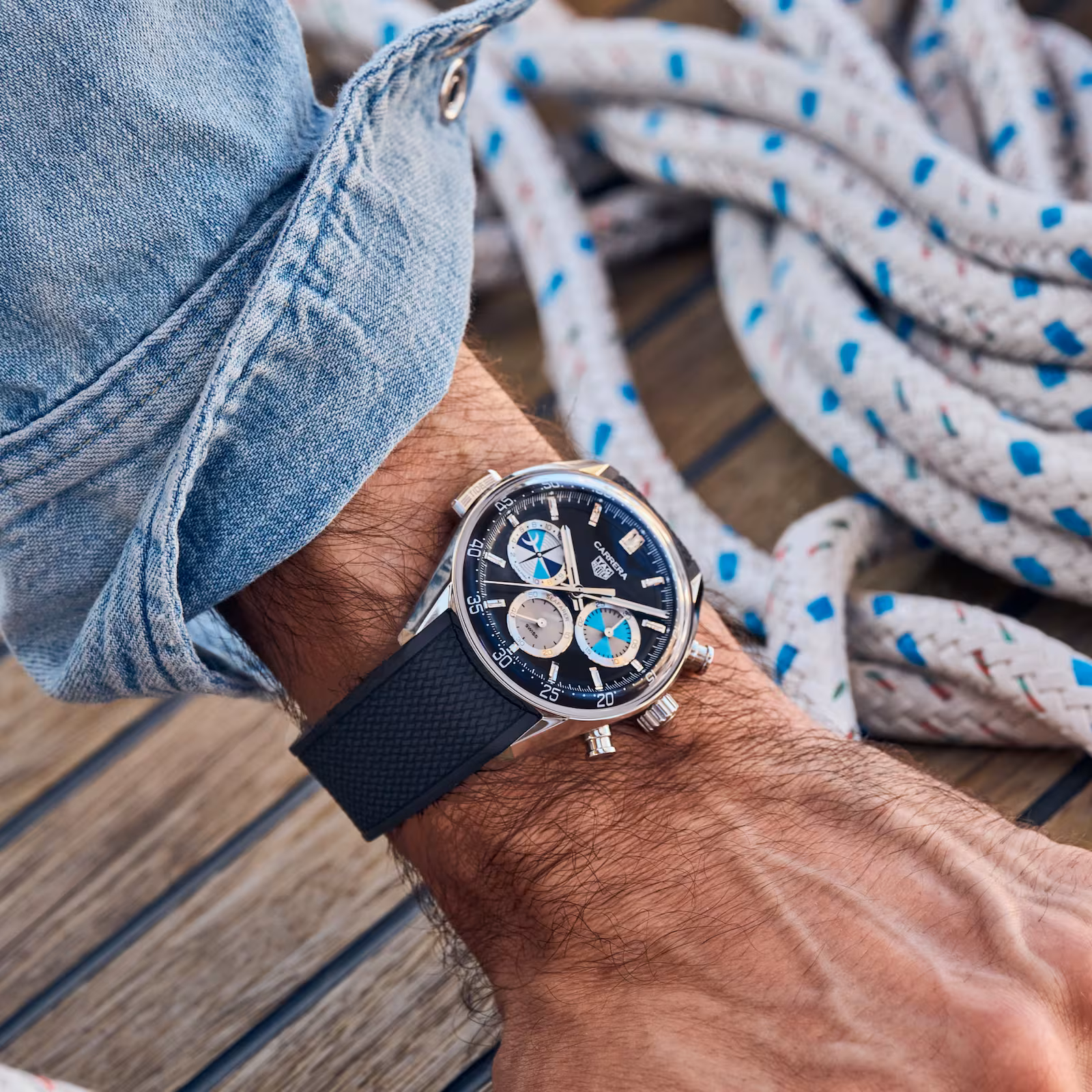 Introducing the TAG Heuer Carrera Chronograph Seafarer x Hodinkee, a limited edition masterpiece timeless design with modern precision. This 42mm stainless steel chronograph features a meticulously designed black opalin dial inspired by the Heuer Seafarer Reference 2446C from 1968 with bold blue accents on the sub counters, ensuring both visual appeal and functional excellence.