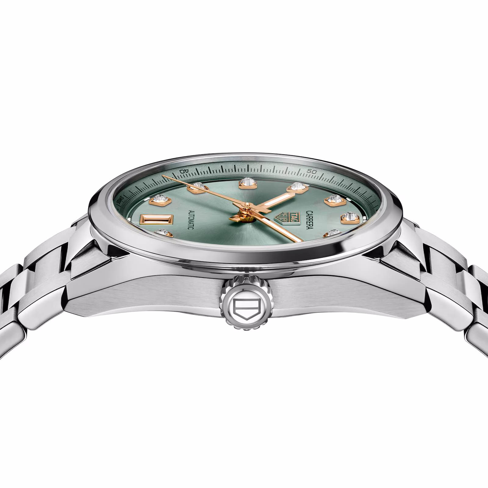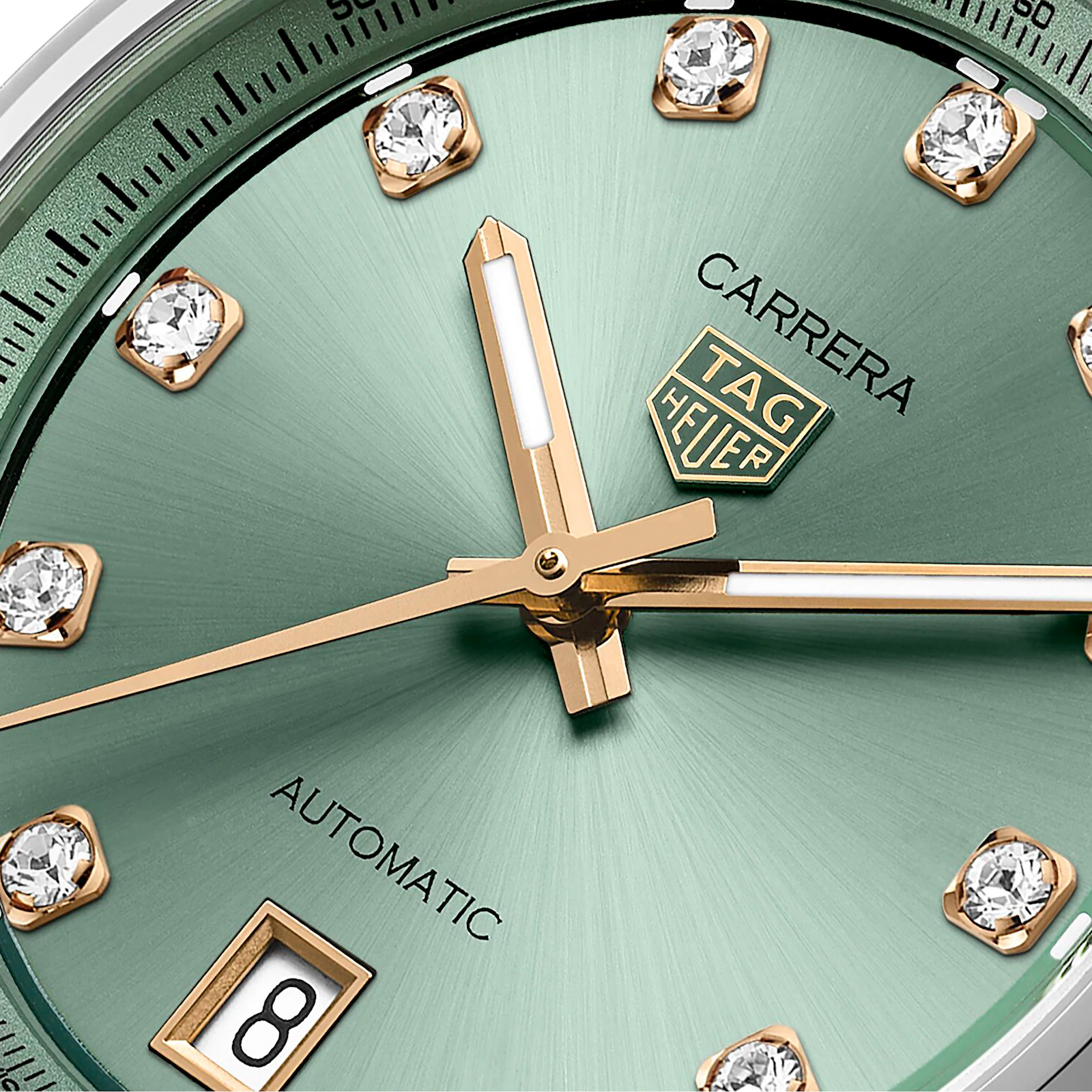 Introducing the TAG Heuer Carrera Date, presented in a 36 mm steel case with a green sunray-brushed dial. This watch redefines modern sophistication. The dial, in a subdued pastel-like green, is set with 11 VS diamonds totaling 0.22 ct that bring a subtle sparkle, complemented by rose gold-plated accents for a refined look.